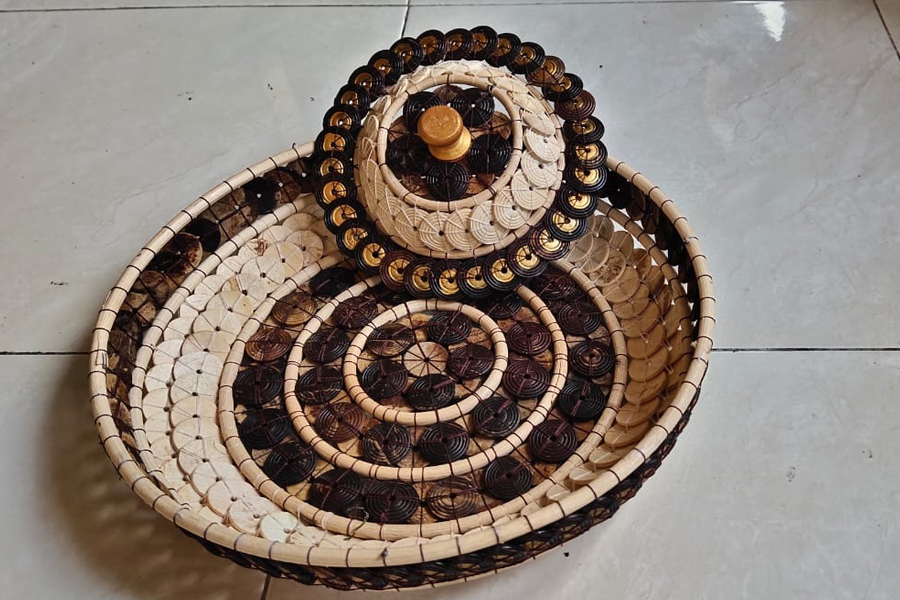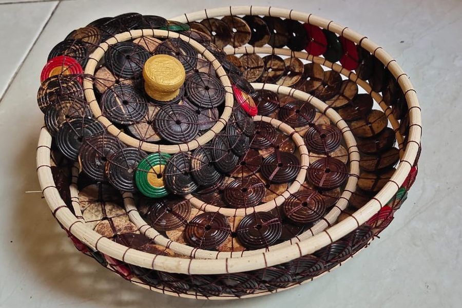 Tamasan seukuran Piring makan ini terbuat dari Batok Kelapa pilihan yang dirakit dengan ketelitian pengerajin yang menghasilkan nilai seni yang tinggi